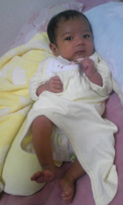 6月3日で3ヶ月になりました(^o^)首据わったし、テレビもよく見るし、きのこ型のガラガラ握らせたらしばらく持ってるし、さっきあやしてたら「あははは!」って声出して笑ったんですよー!びっくりして即パパにメールしましたo(^-^)o