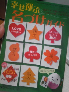 性別が分かる前から2人でコレ見てました。ただのたまごクラブのおまけ本なんですが…本屋でよく見かける「姓名判断」や「名付け事典」はありえない名前が多いし、ややこしくて(>A<;)こっちのほうが流行りの名前とか多くてよっぽど実用的だと思います。(流行りの名前が好きな訳じゃないんですが、無難で自然な名前って意味で…)