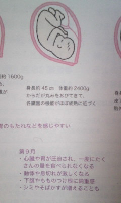 5月に出産したばかりの学さんのお姉さんと話してても、やっぱり9ヶ月目、10ヶ月目はすごいスピードで赤ちゃんの体重が増えるうえに今は胃が圧迫されてあんまり食べずに済んでるのが、出産が近づくにつれて赤ちゃんの位置が下がってきて食欲が出ちゃって急激に太る事がよくあるみたいで(>_<;;)だいたいの人が12.3㌔位まで増えちゃうみたいです。ソコはホントに気をつけようと思います。脂肪で産道が狭くなって難産なんて嫌過ぎる;;
