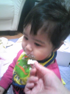 ケーキは切り分けてから赤ちゃん用の割れない深めのおさらに入れて安全なフォークも渡して好きなように自分で食べさせてあげました☆最初はフォークで食べようとがんばってましたが次第に乱暴になってきて フォークも投げ出して手づかみに(笑)もう手も服もテーブルもケーキもぐっちゃぐっちゃです(゜o゜)それは覚悟の上だからいいんですけどカーペットに何か敷いといたらよかった!失敗!でも本人はめっちゃ楽しそうでしたよ~!もう真剣!(^0^)ケーキ美味しくて大好きだから、口に入れようと必死になってました。でもあんまり入ってないから手伝ってあげました。こんなにたくさんたべていいのは今日だけです!