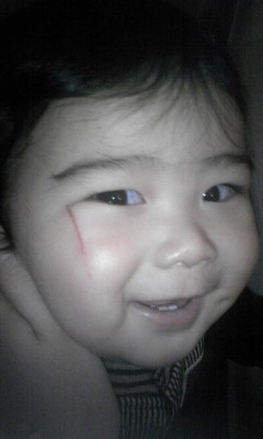それとあすむくん買ってきたばっかのティッシュにのぼって転倒して食器棚の角に顔面ぶつけて顔が切れてます。今でこそ笑ってますがぶつかった時はそりゃぁもうすごい泣きっぷりでした(笑)窒息しそうな程(笑)